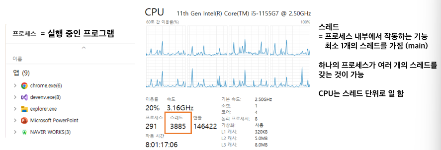 Task, async, await- 간편하게 멀티스레드를 구현하기 위한 기능- Task, Task비동기 작업을 나타내는 객체비동기 작업의 완료, 실행, 또는 함수 실행 결과를 반환하는 역할을 수행- async메소드 선언 앞에 async가 있다면 비동기로 실행이 가능한 메소드void, Task 또는 Task만 반환할 수 있으나, void 반환 시 호출하는 쪽에서 비동기 처리가 불가능await을 통해 호출되어야 비동기로 작동함- await 작업이 끝나기를 기다리지만 스레드를 멈추지는 않음Task 또는 Task 반환하는 메소드만 기다릴 수 있음async로 선언된 메소드에서만 사용 가능 - async로 선언되고 Task를 반환하는 메소드를 async로 선언된 다른 메소드에서 await로 호출해서 사용하는 것이..